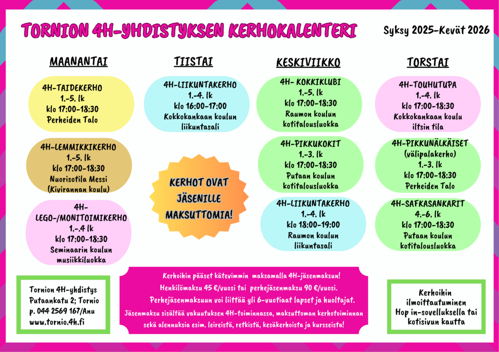 Kerhomaksu koskee yhtä kerhoa. Maksu on 45€/hlö ja se on voimassa kerhokauden (syksy-kevät).