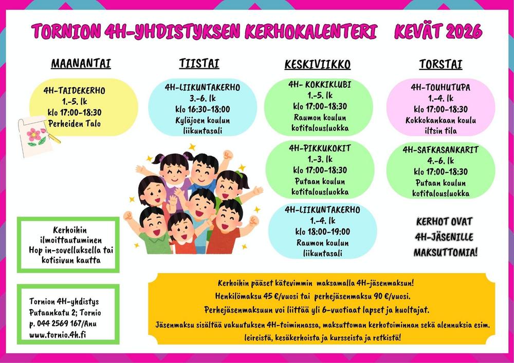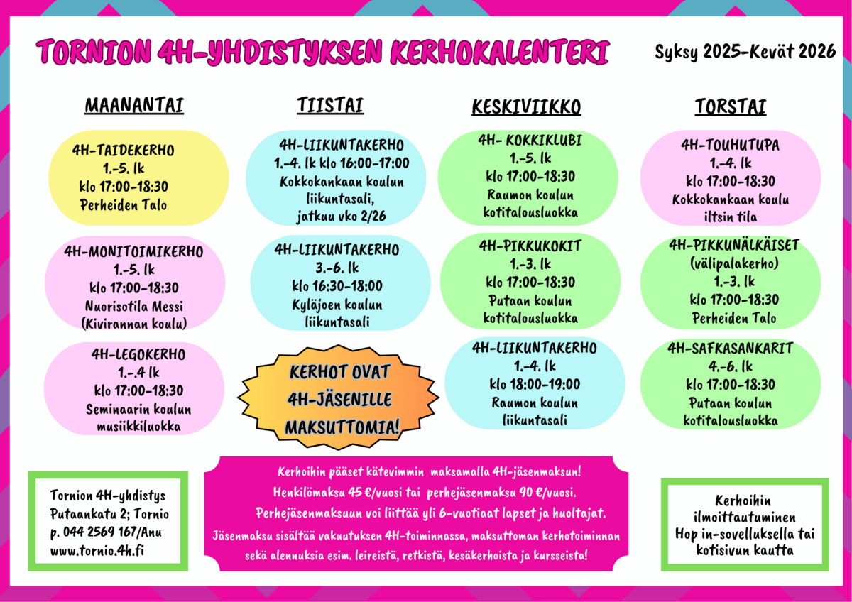 Kerhot toimivat syyskuusta toukokuuhun. Syyskauden kerhot toimivat viikot 38-50. Kevään kerhokausi on viikot 2-20. Kerhoihin voi tulla mukaan myös kesken kerhokauden.