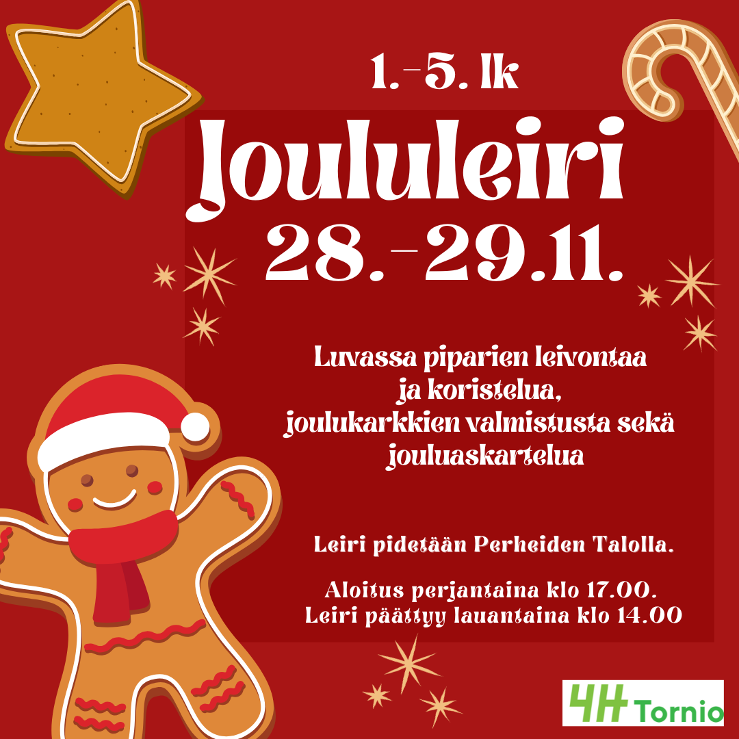 Joululeiri 28.-29.11.2025 Kahden päivän mittainen jouluteemainen leiri 1.-5. lk lapsille. Leirillä on mukavaa yhdessä tekemistä jouluteemalla, kädentaitoja, pipareiden leivontaa, pelejä ja leikkejä.…