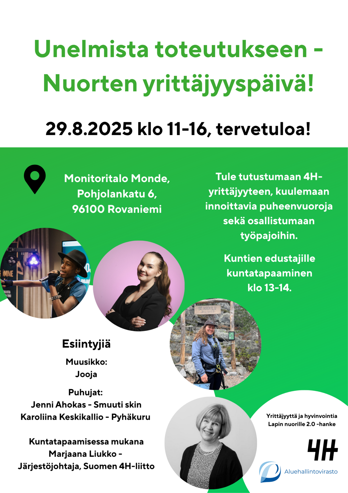 Unelmista toteutukseen – Nuorten yrittäjyyspäivä on 29.8.2025 Rovaniemellä, Monitoritalo Mondella, Pohjolankatu 6. Tapahtuma aukeaa klo11 ja päättyy klo 16. Tapahtuma on maksuton.